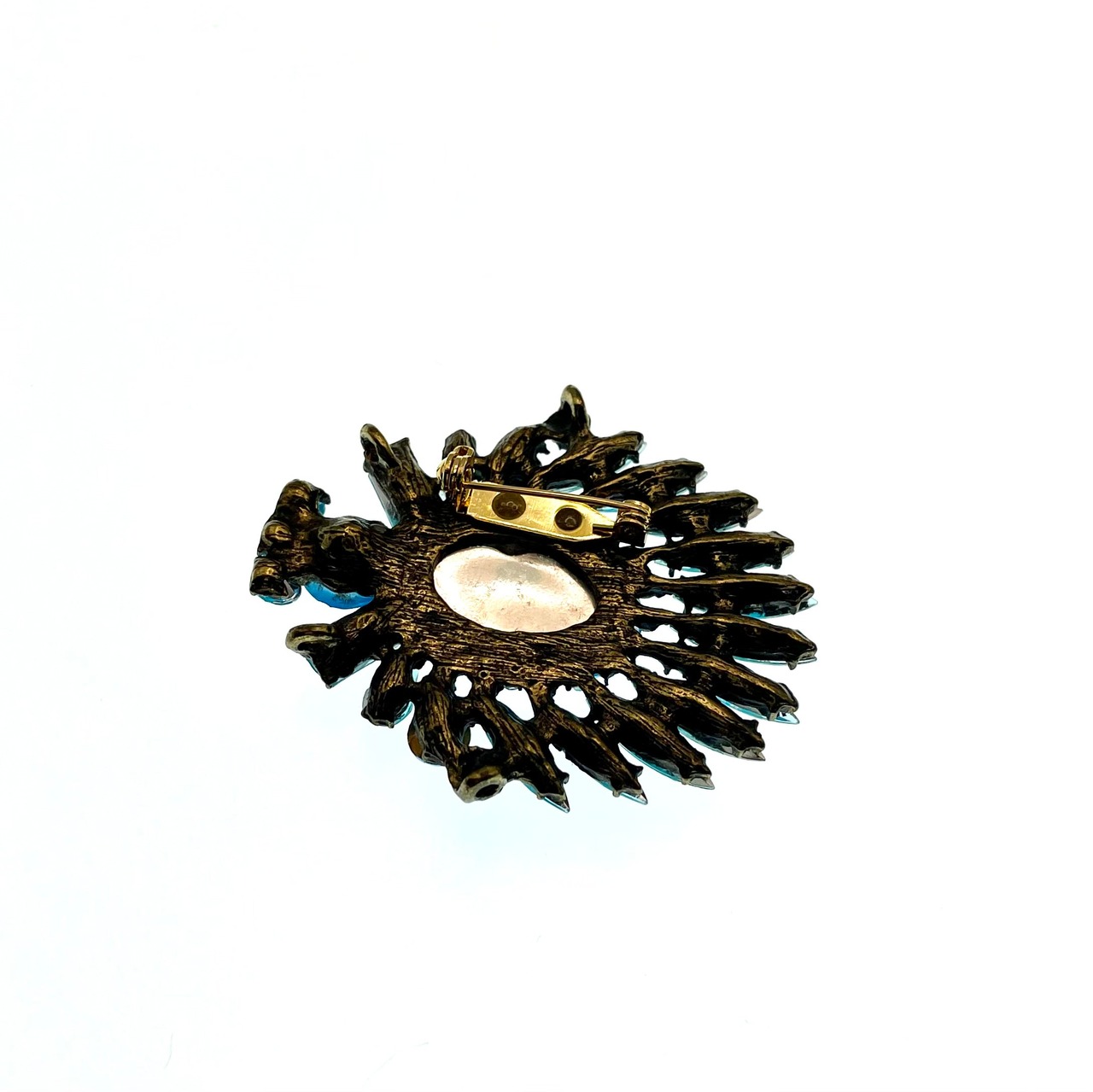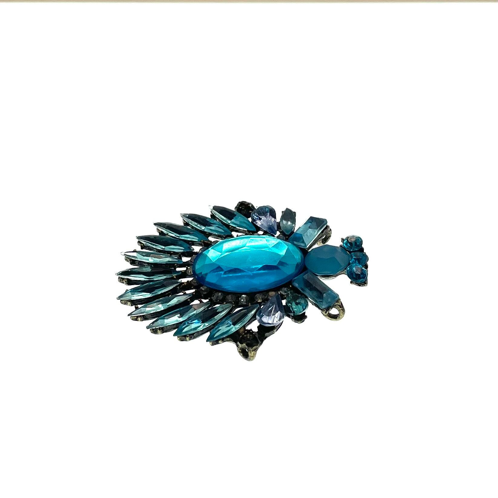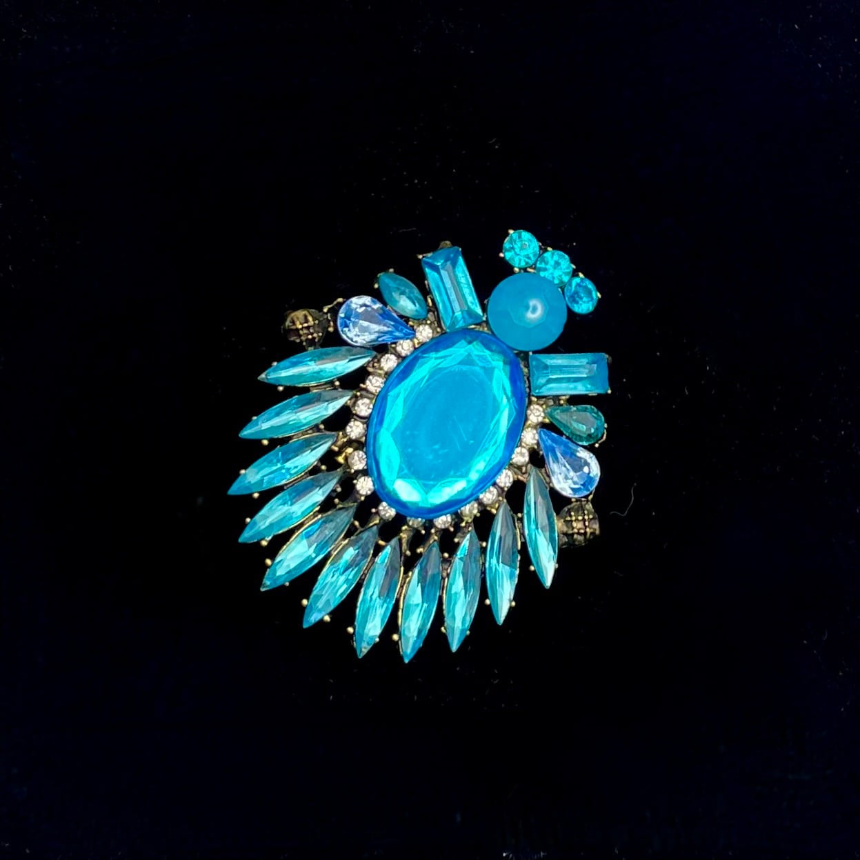 鮮やかなシアンブルーのストーンがセットされた、アールデコ調のプローチです。