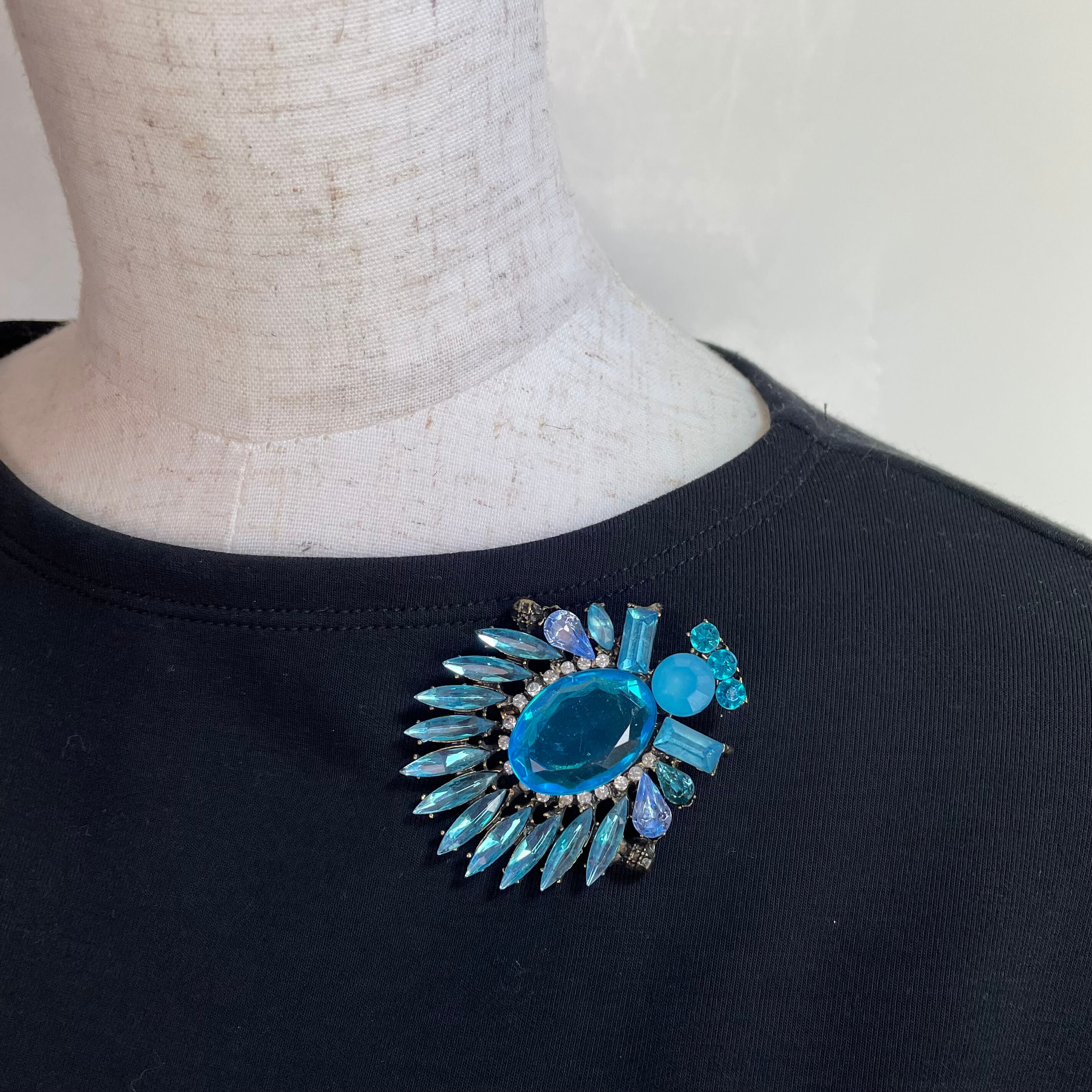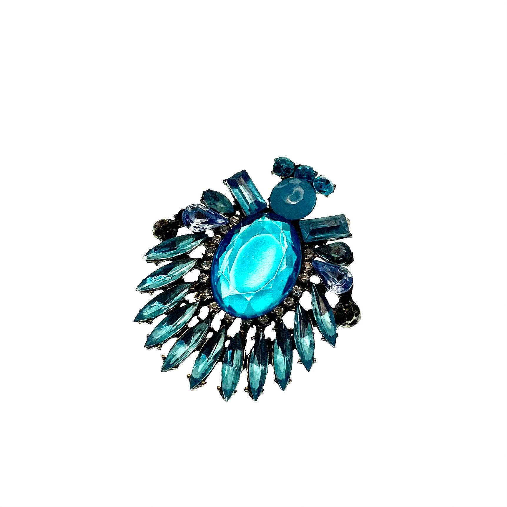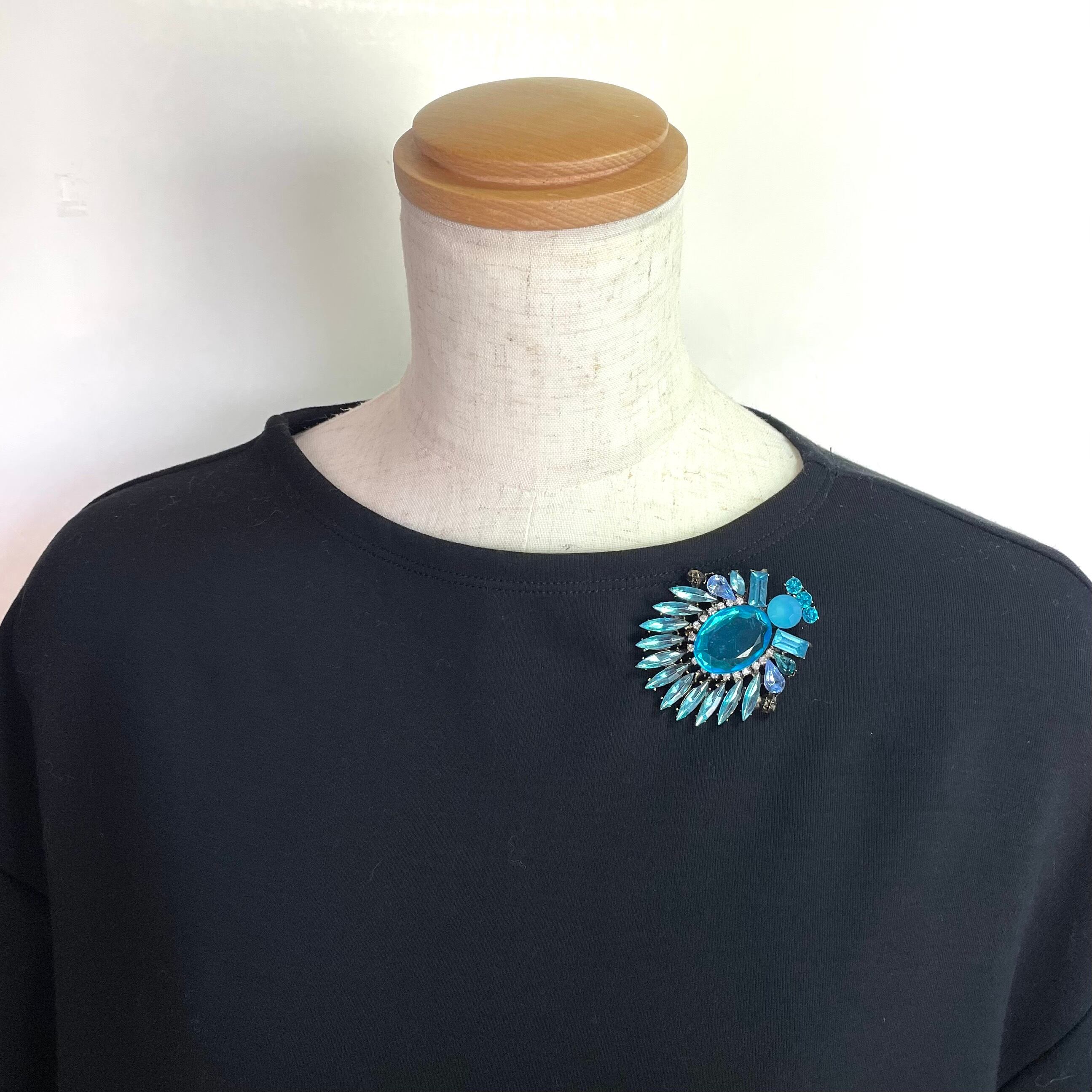 鮮やかなシアンブルーのストーンがセットされた、アールデコ調のプローチです。