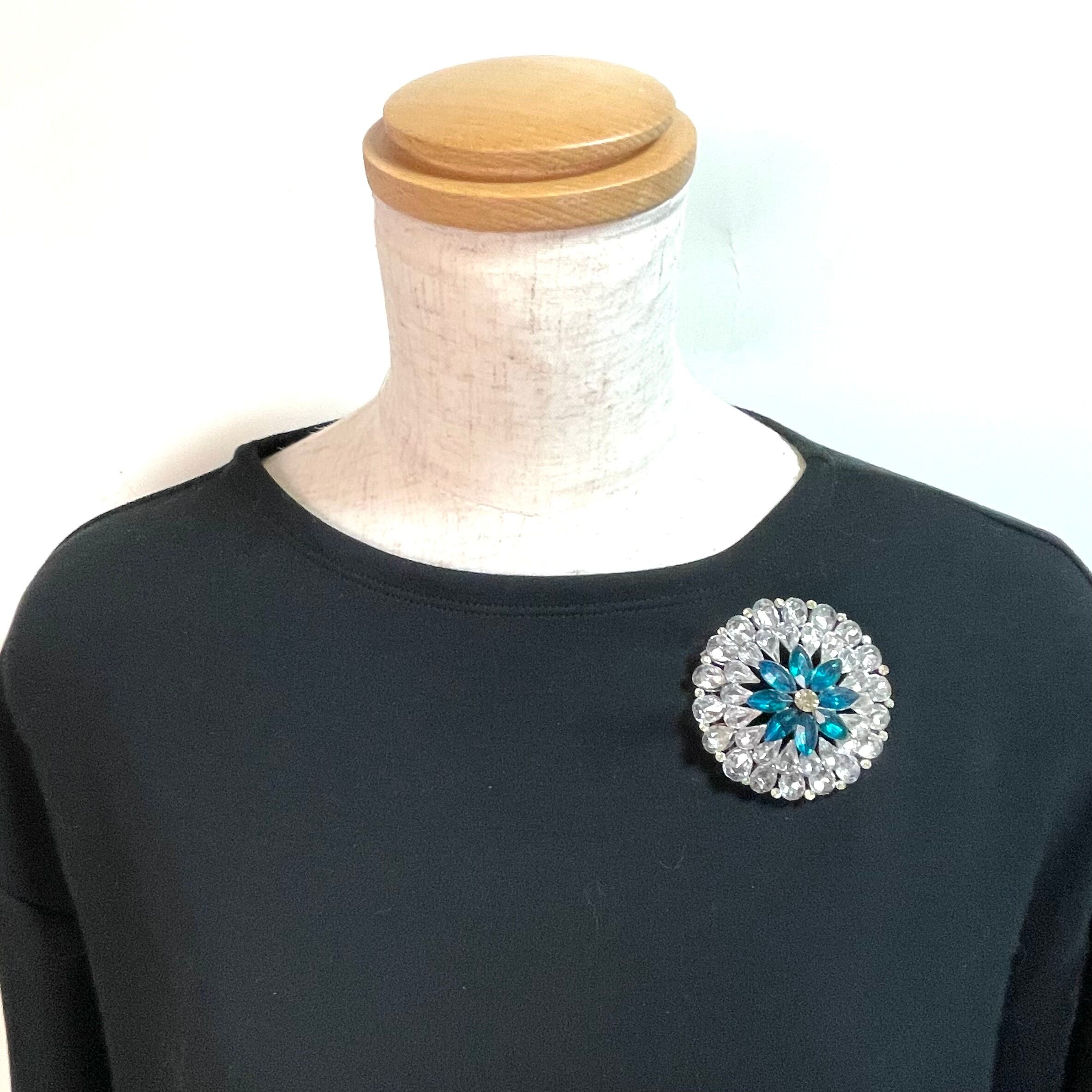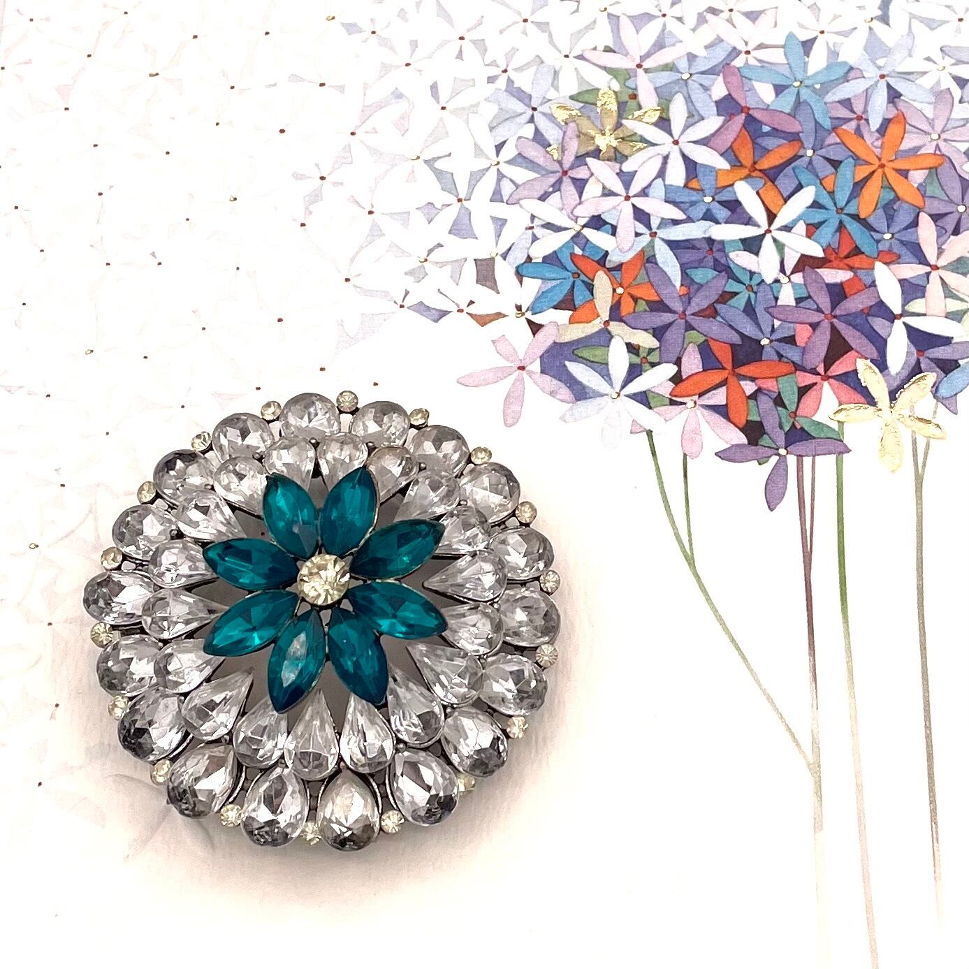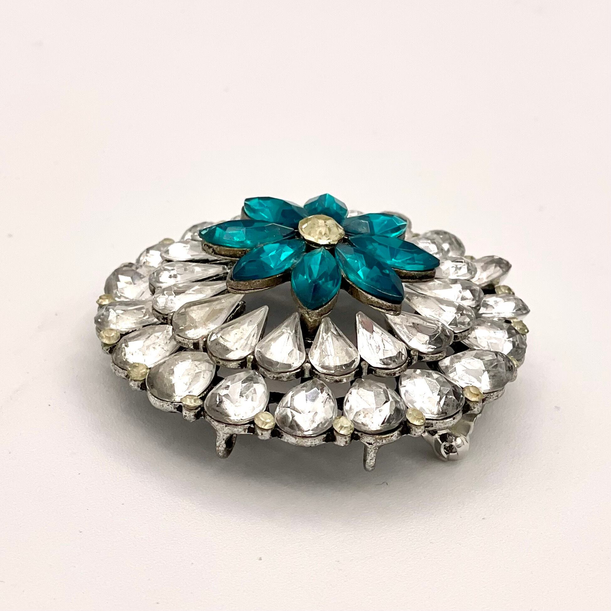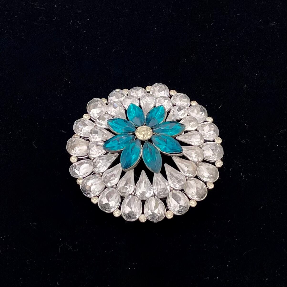 透明感あふれるクリスタルストーンが花びらのように連なり、中央には深いブルーが印象的にきらめく華やかなブローチ。