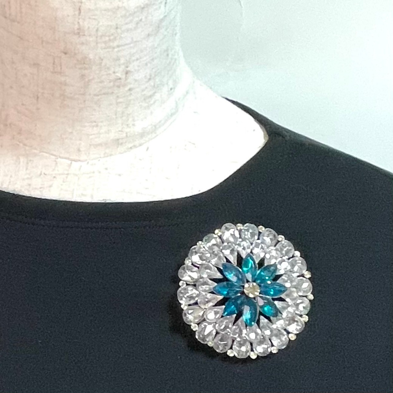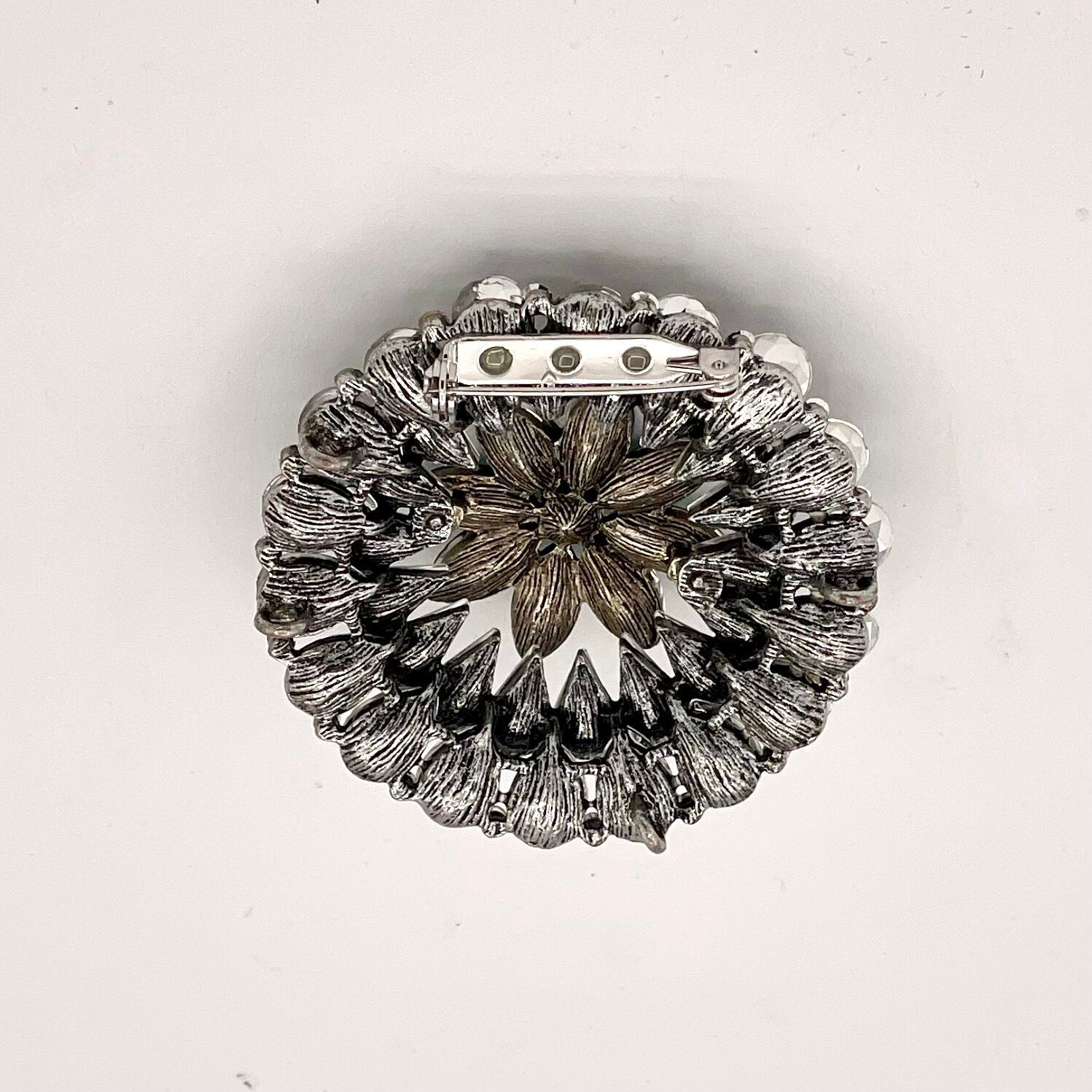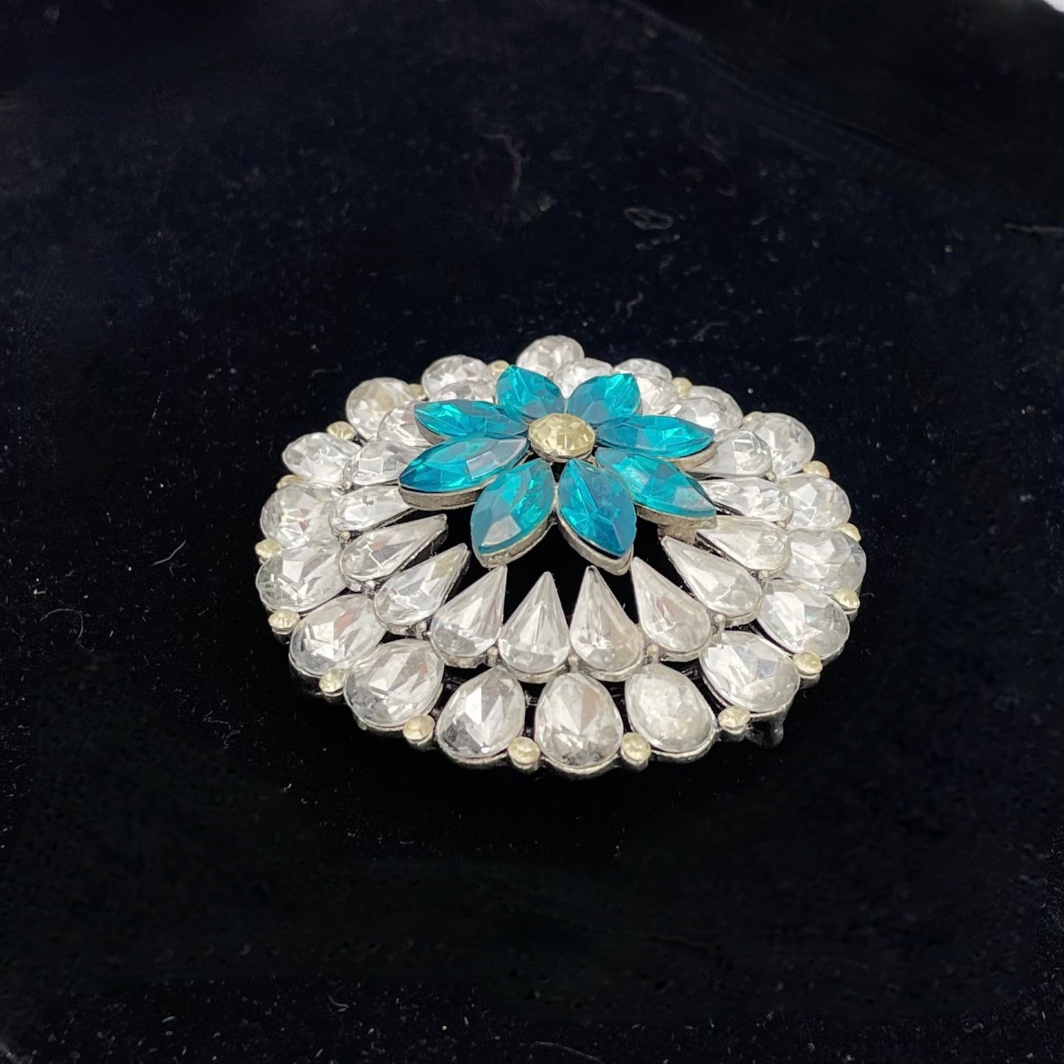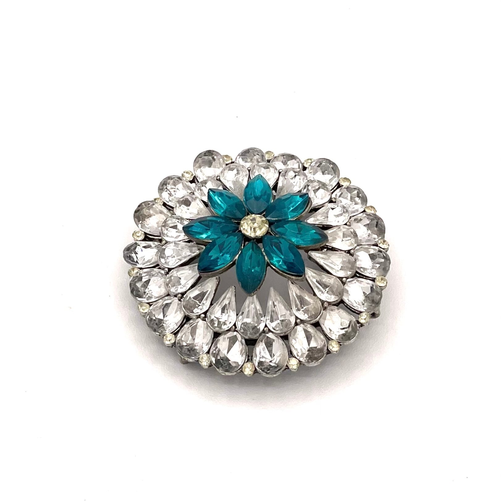 透明感あふれるクリスタルストーンが花びらのように連なり、中央には深いブルーが印象的にきらめく華やかなブローチ。