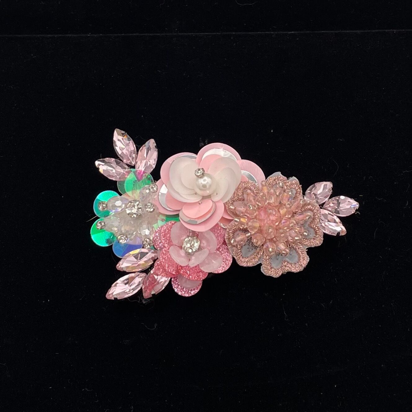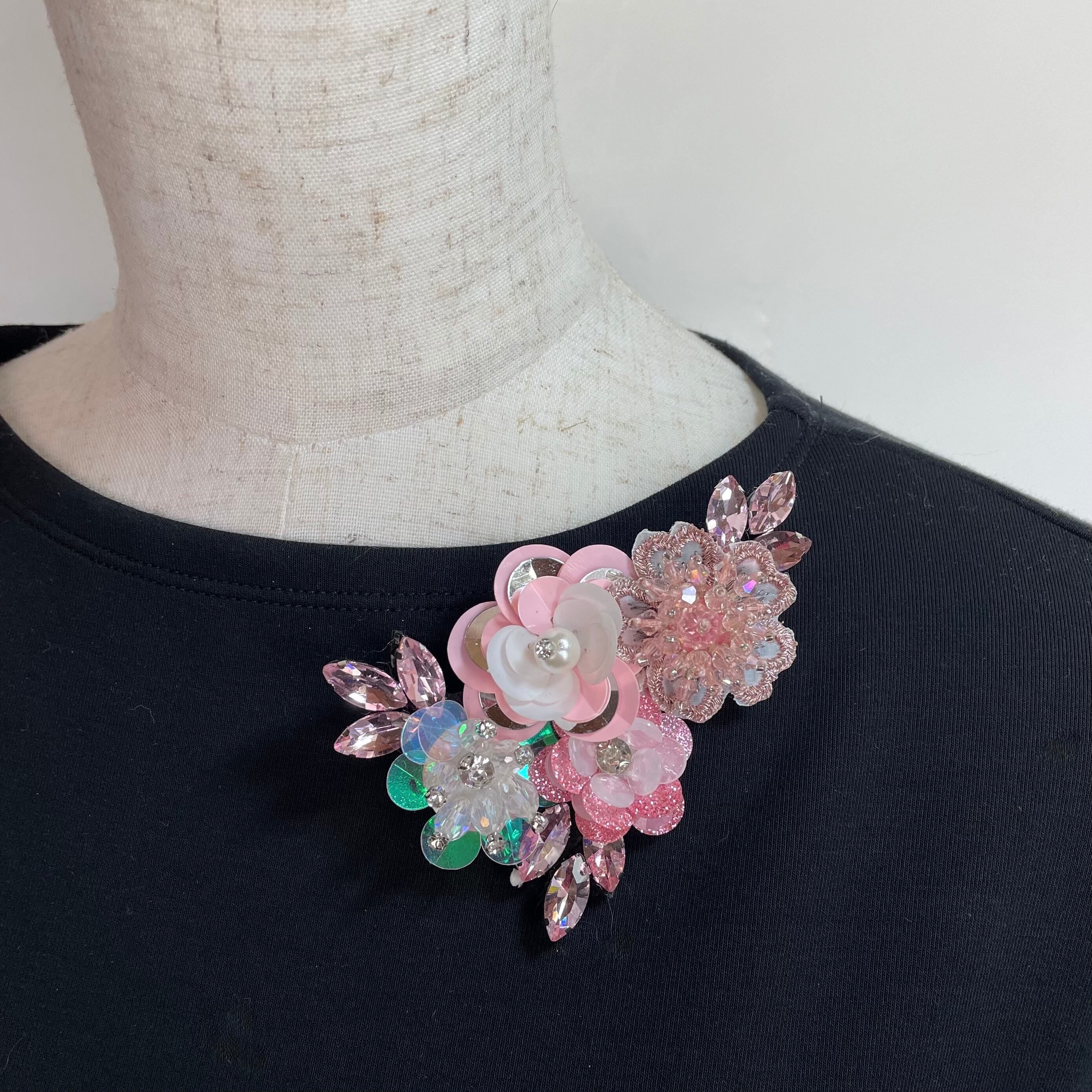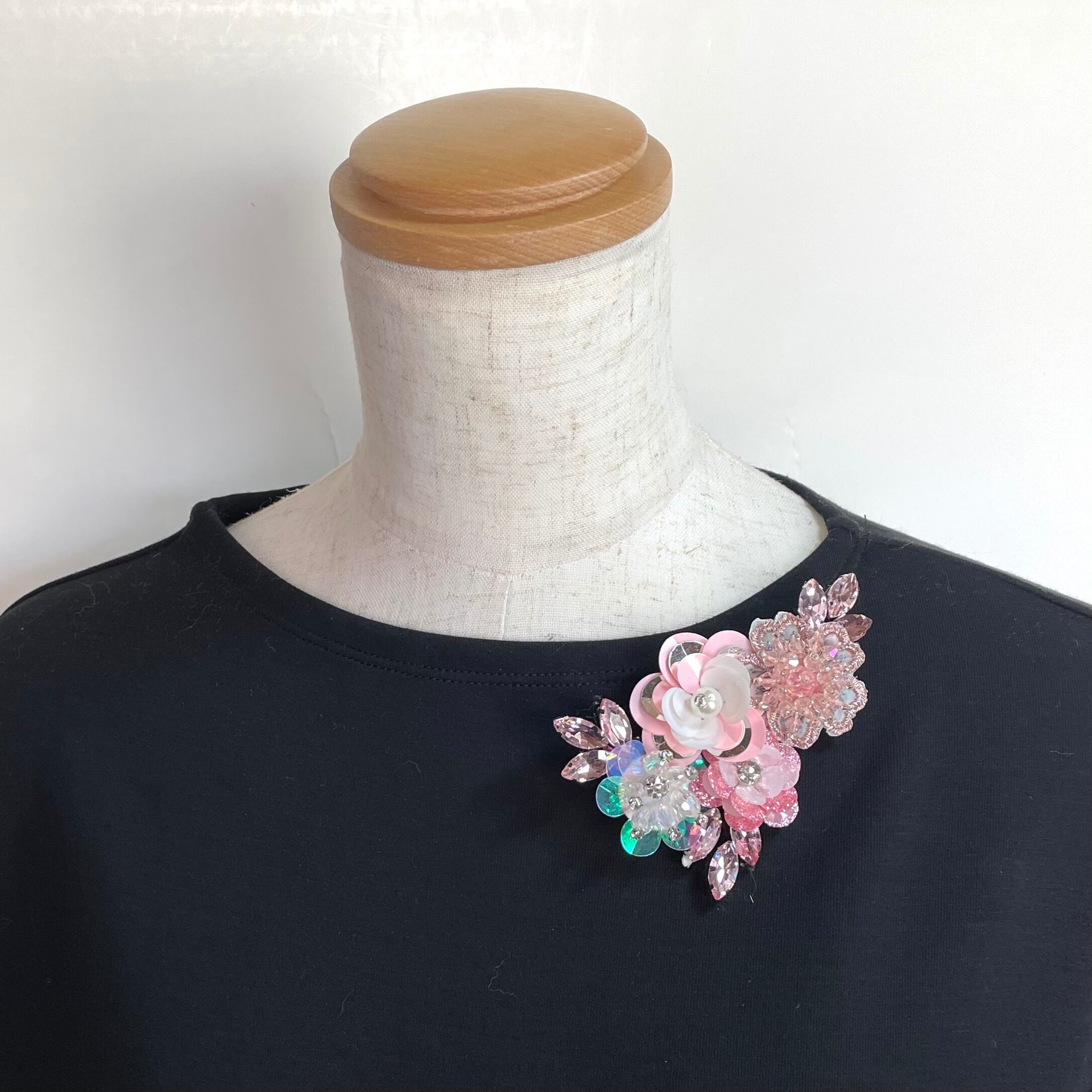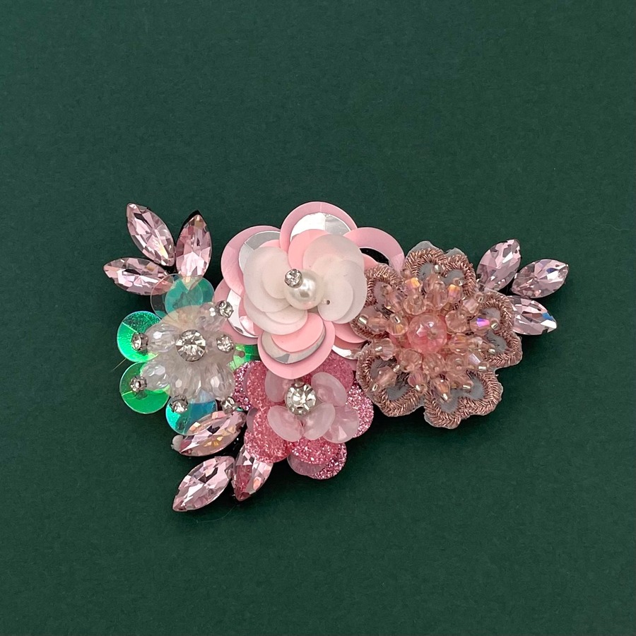 ピンクを基調とした多彩な花モチーフが立体的に輝き、光を受けるたびに華やかなオーラを纏います。