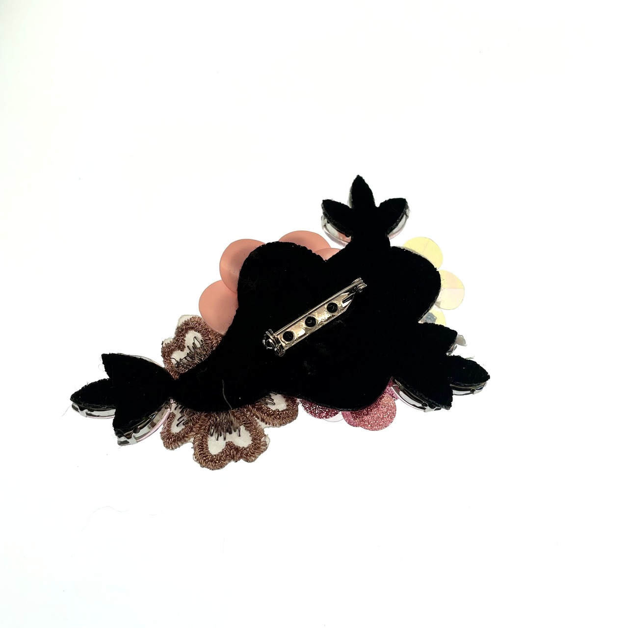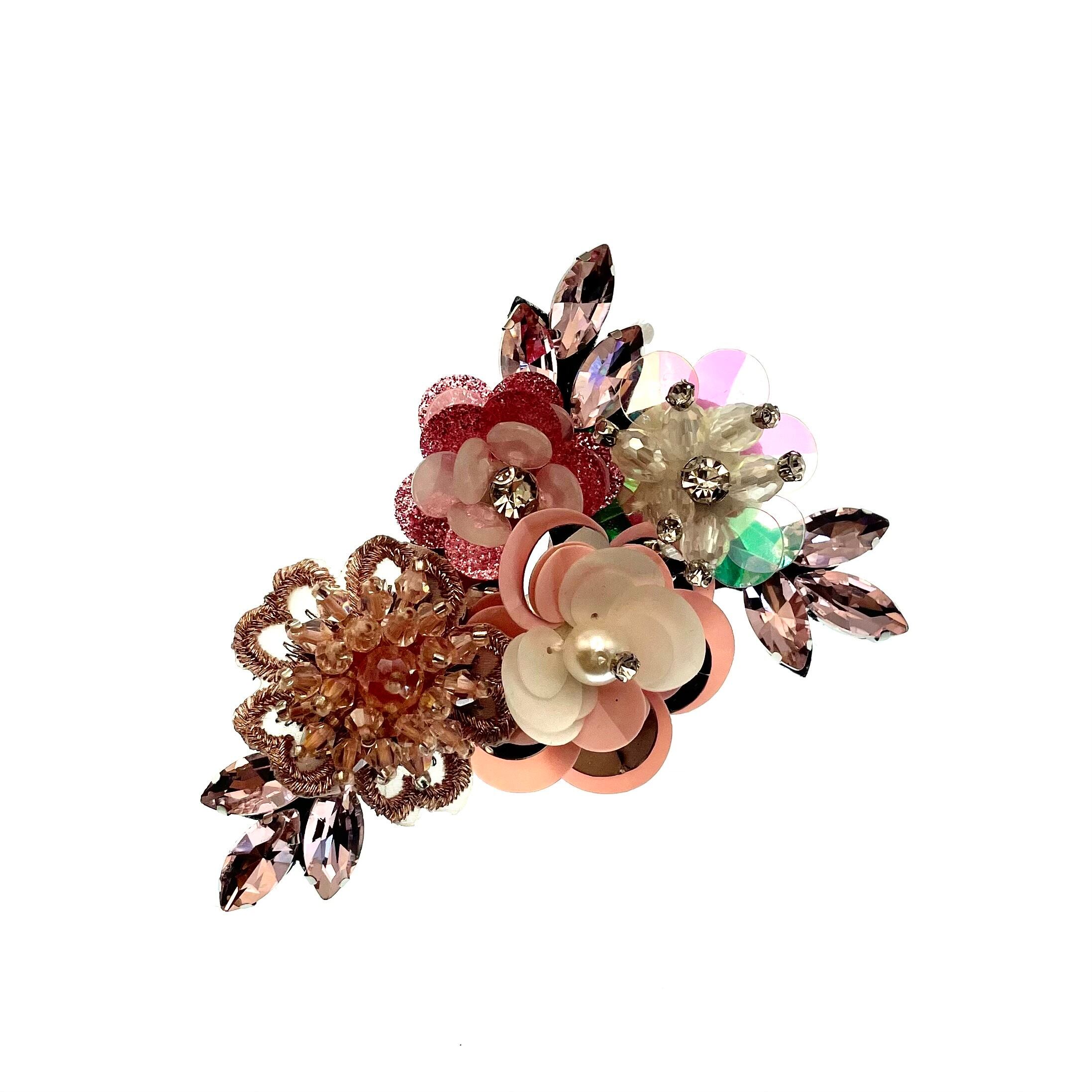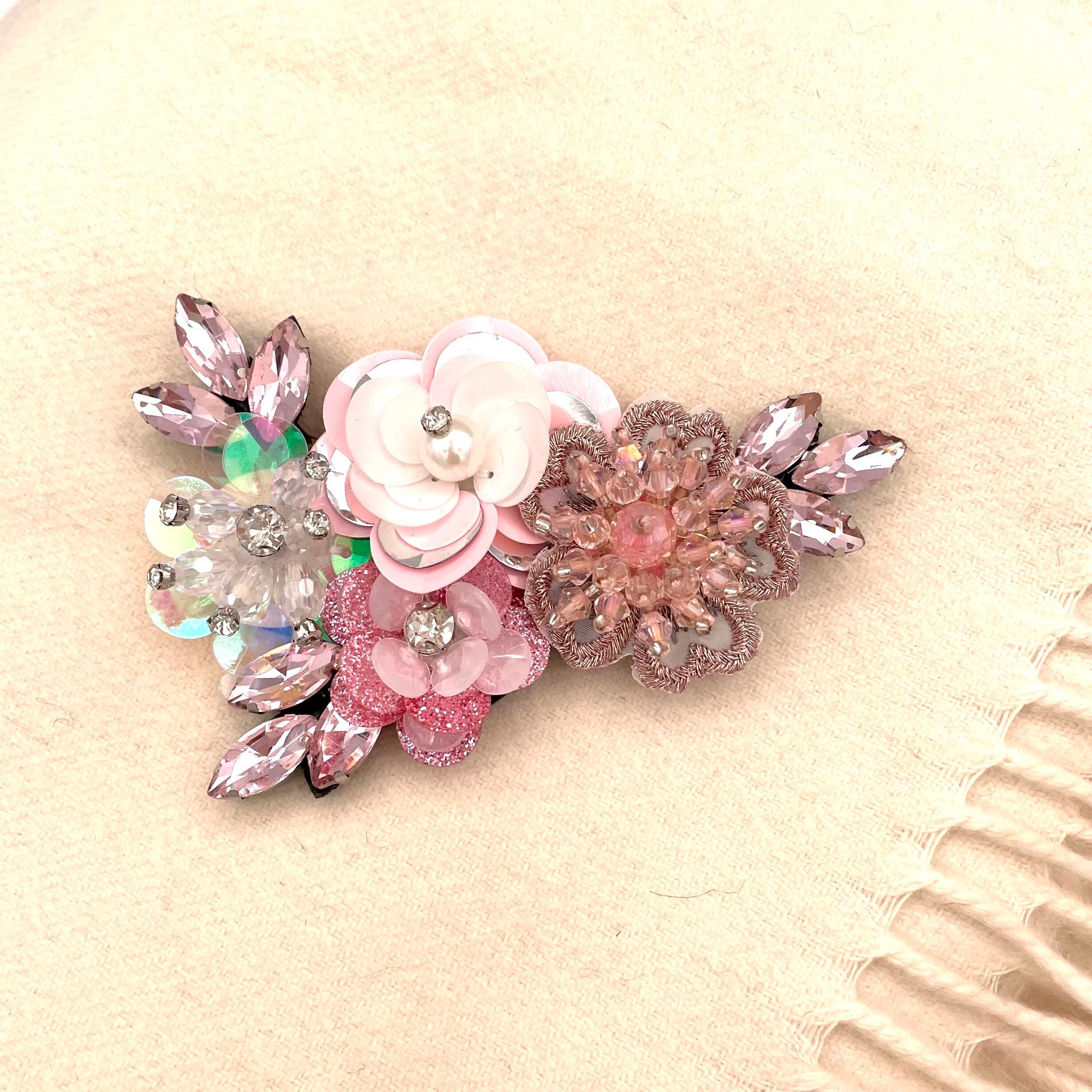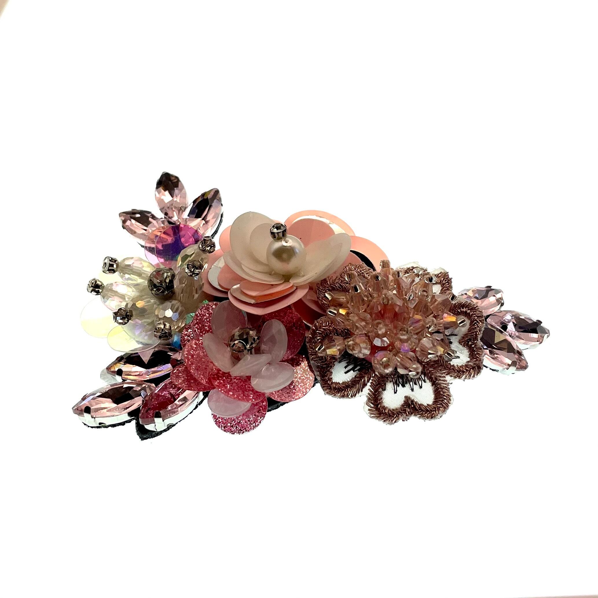 ピンクを基調とした多彩な花モチーフが立体的に輝き、光を受けるたびに華やかなオーラを纏います。