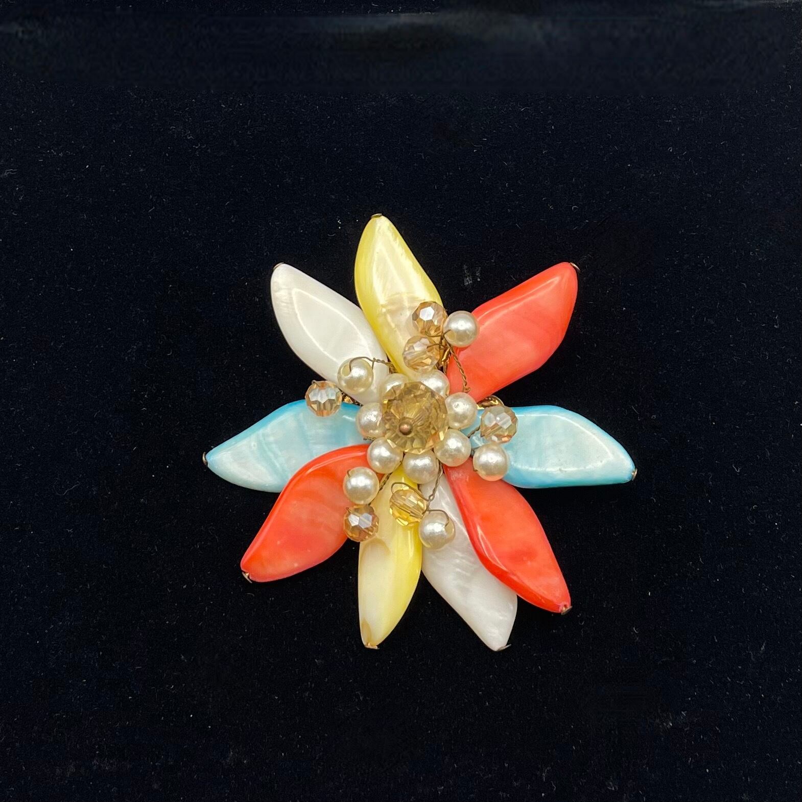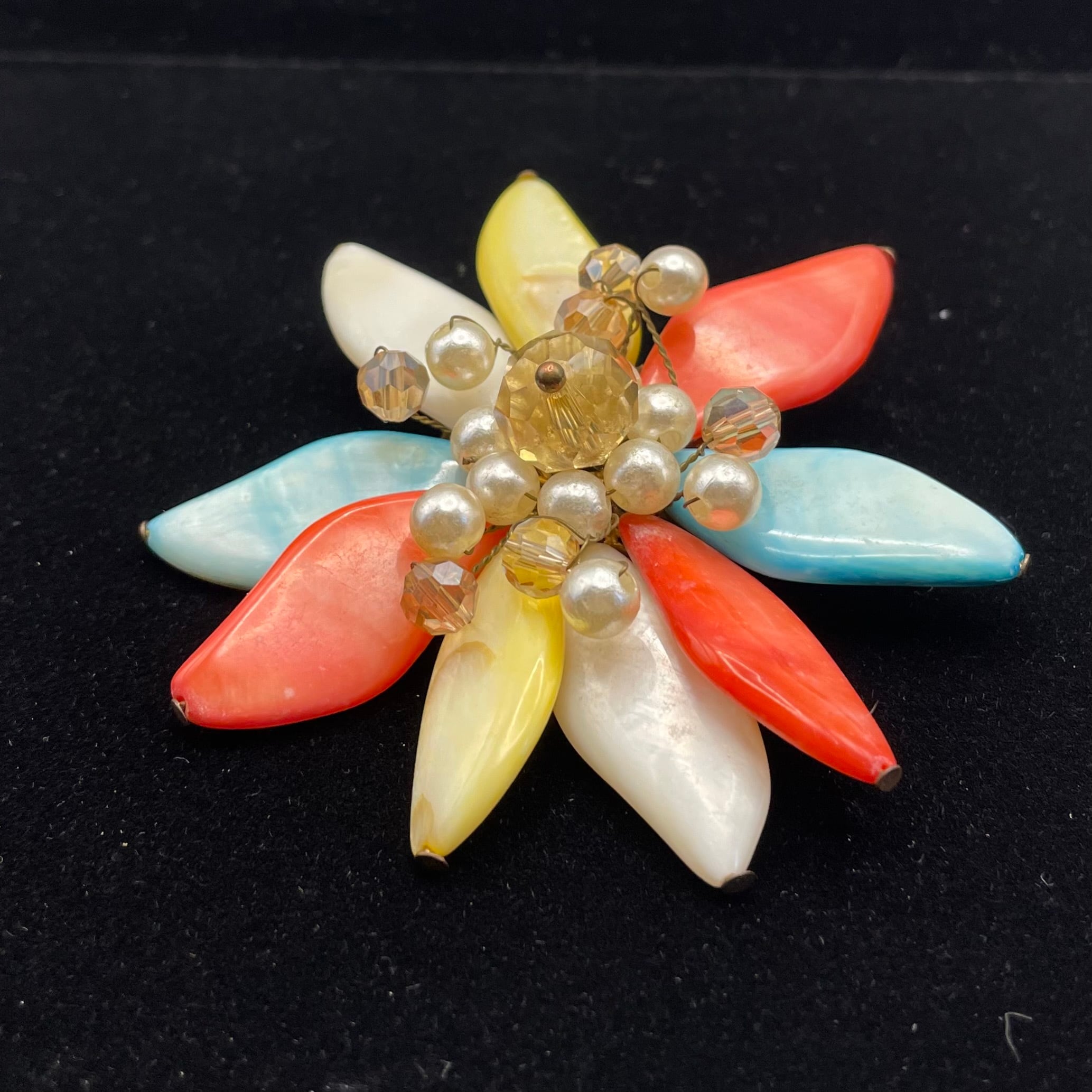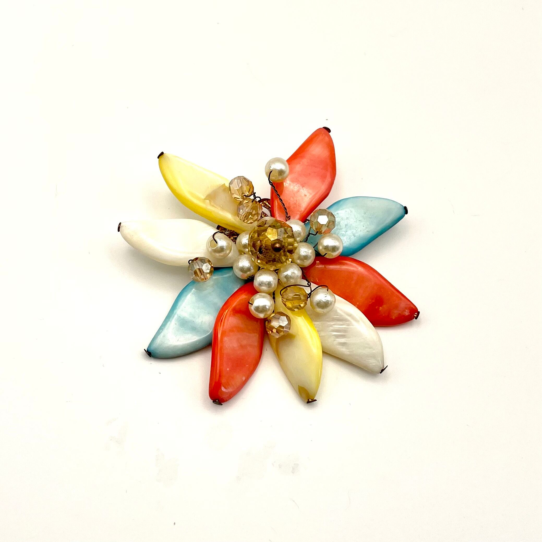 赤・黄色・白・ブルーの柔らかな輝きを放つパーツが重なり合い、中央にはパールとクリアビーズがきらめく、いかにもインポートものらしい個性的なデザイン。