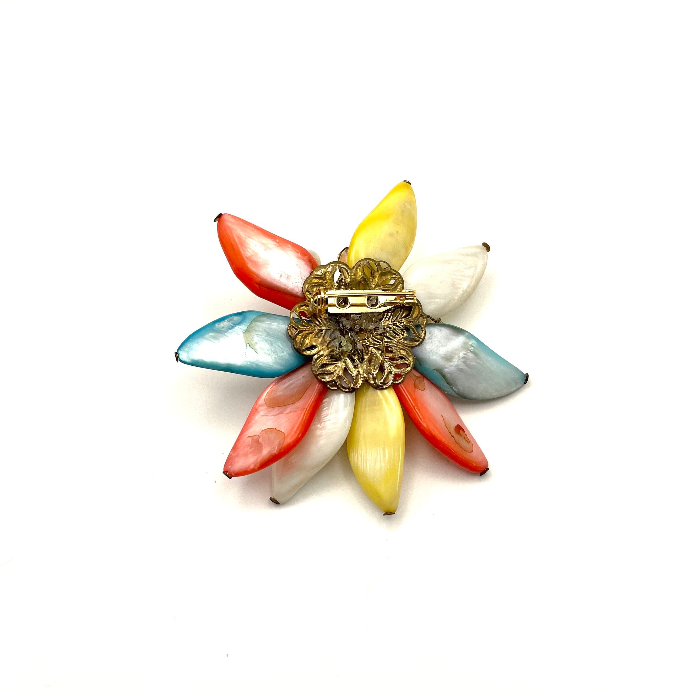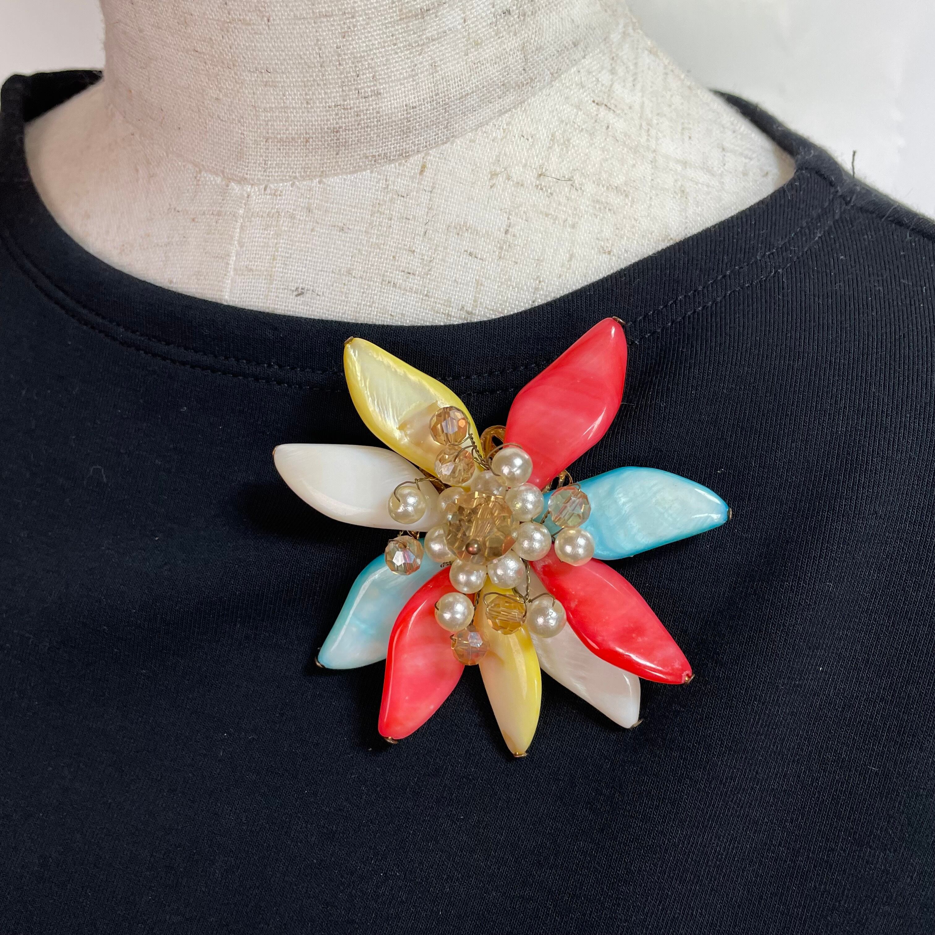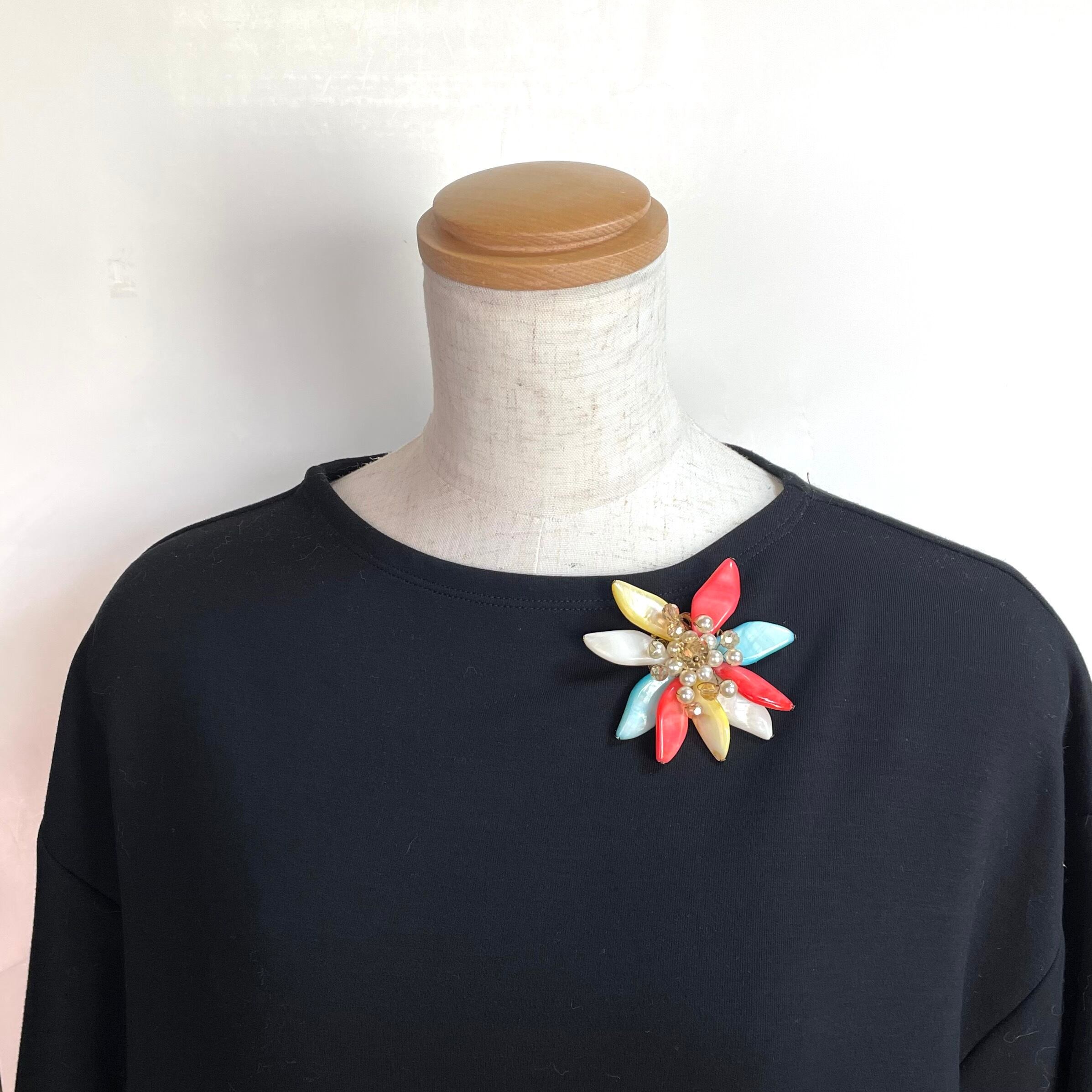 色鮮やかな花びらが胸元を華やかに彩る、存在感抜群のフラワーブローチです。