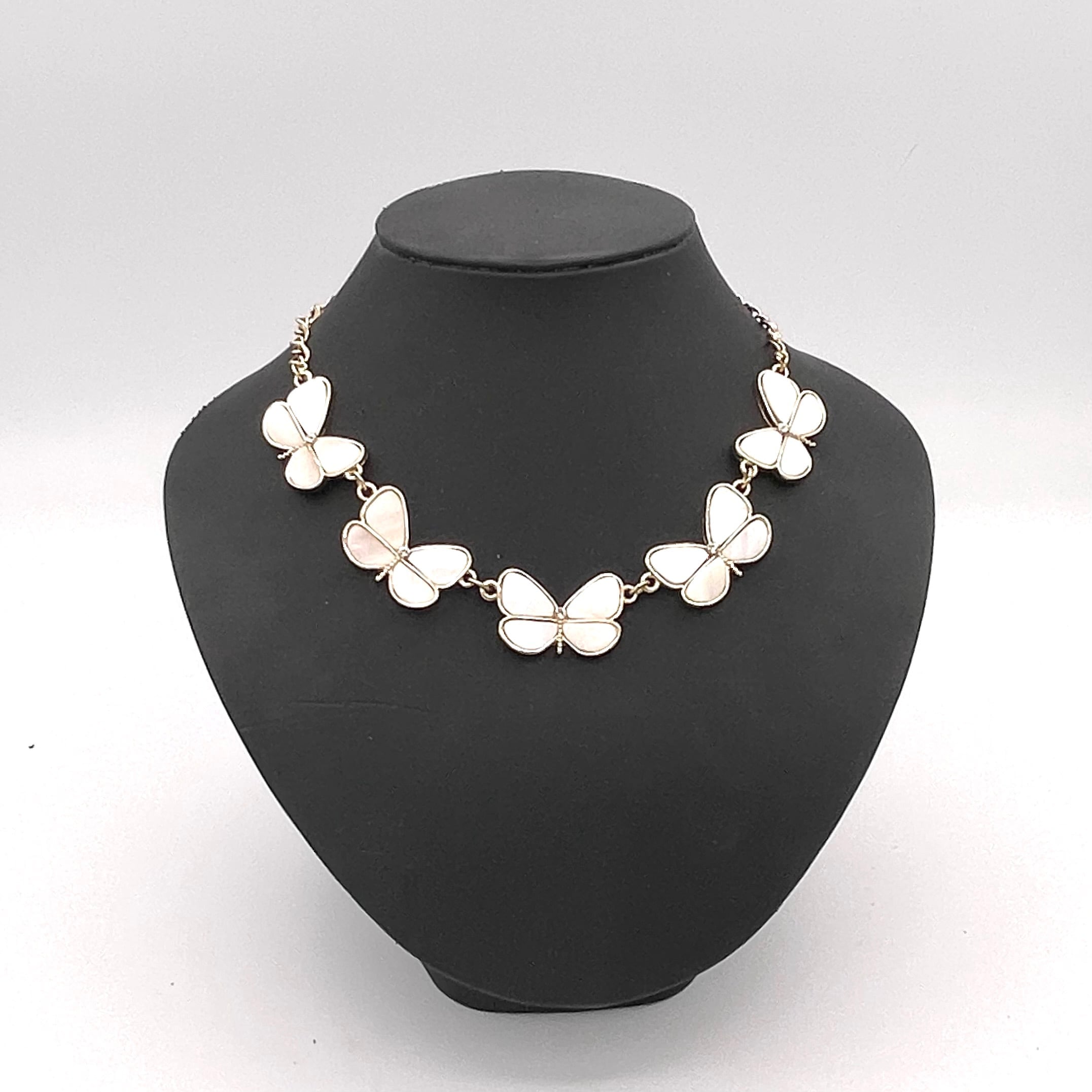 柔らかい光沢を放つシェルホワイトのバタフライが連なる、優雅なネックレスです。