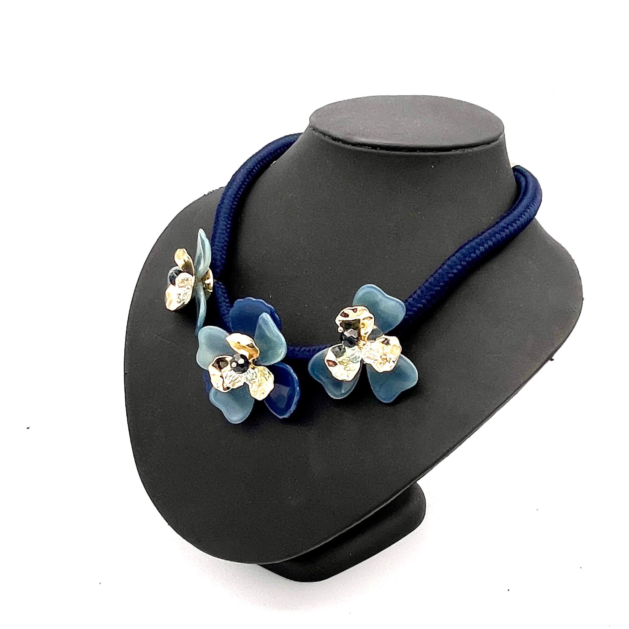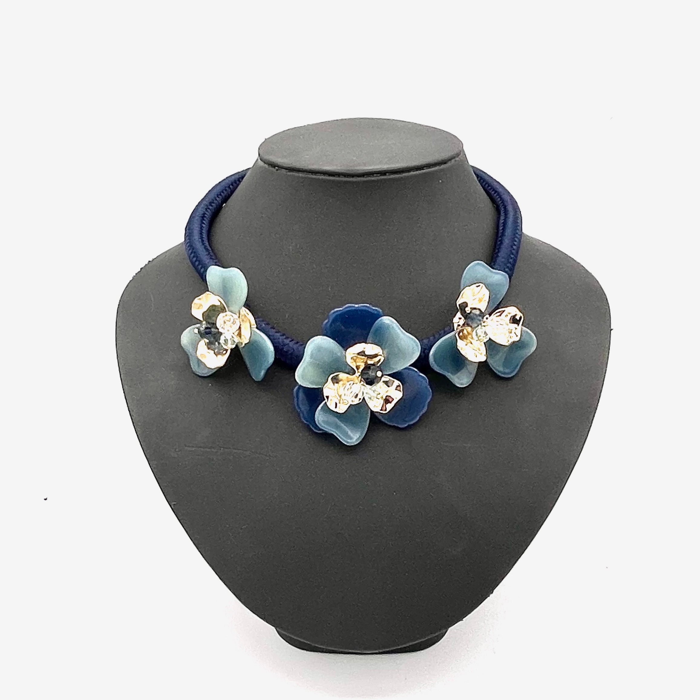 ふっくらした立体的なフラワーモチーフに、ゴールドの花弁ときらめくカットビーズがセットされた優美なデザインのネックレスです。