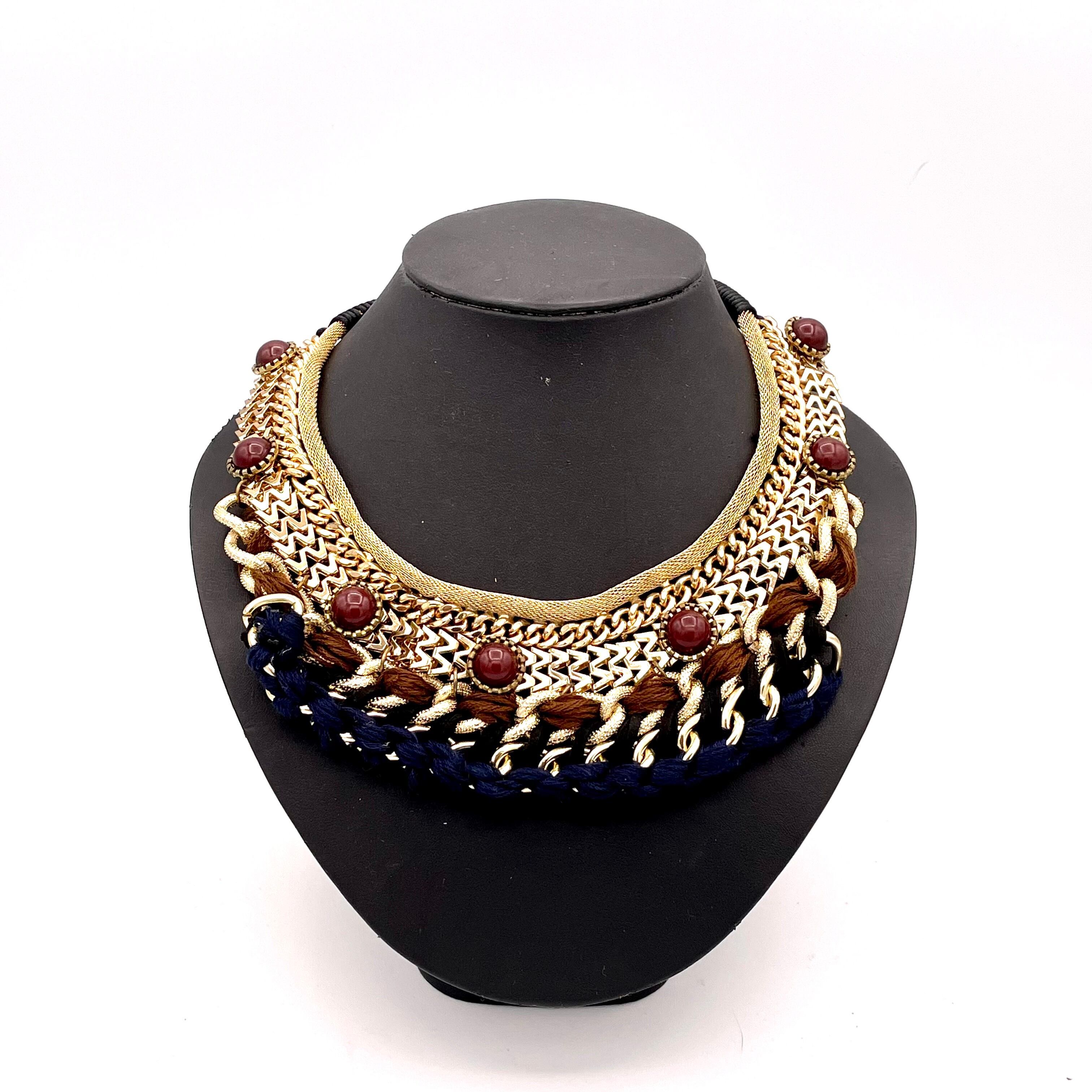 繊細に編み込まれたゴールドチェーンとネイビー&ブラウンカラーのコードがプラスされた、ゴージャスなネックレス。
